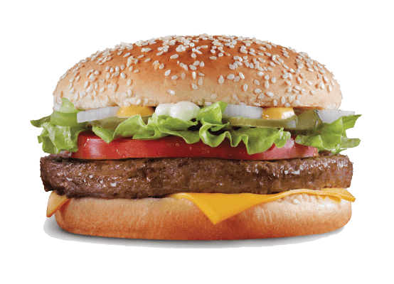 Hambúrguer de vaca o frango, queijo, alface, tomate, cebola e molho